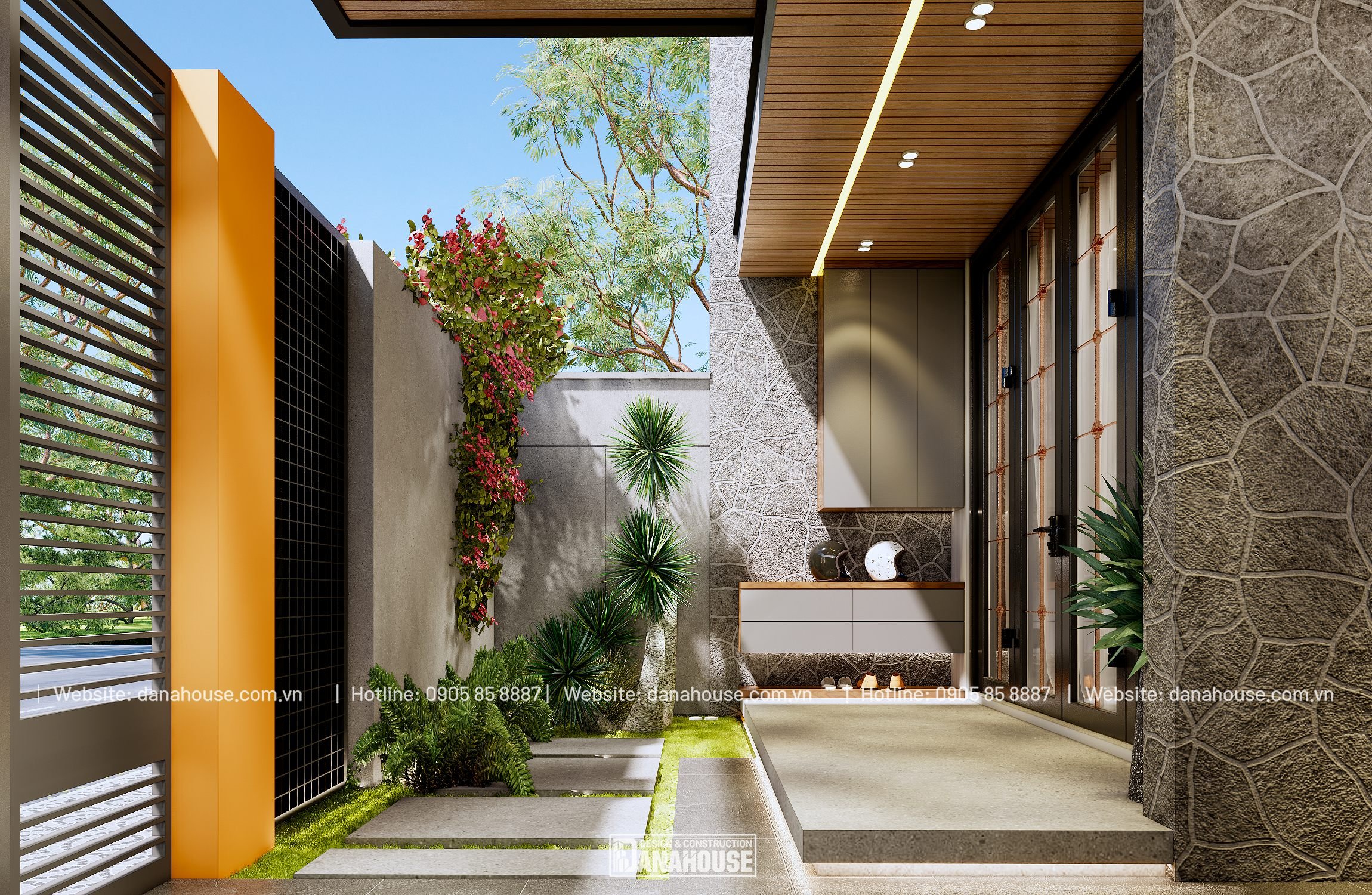 - Sân trước và lối vào: