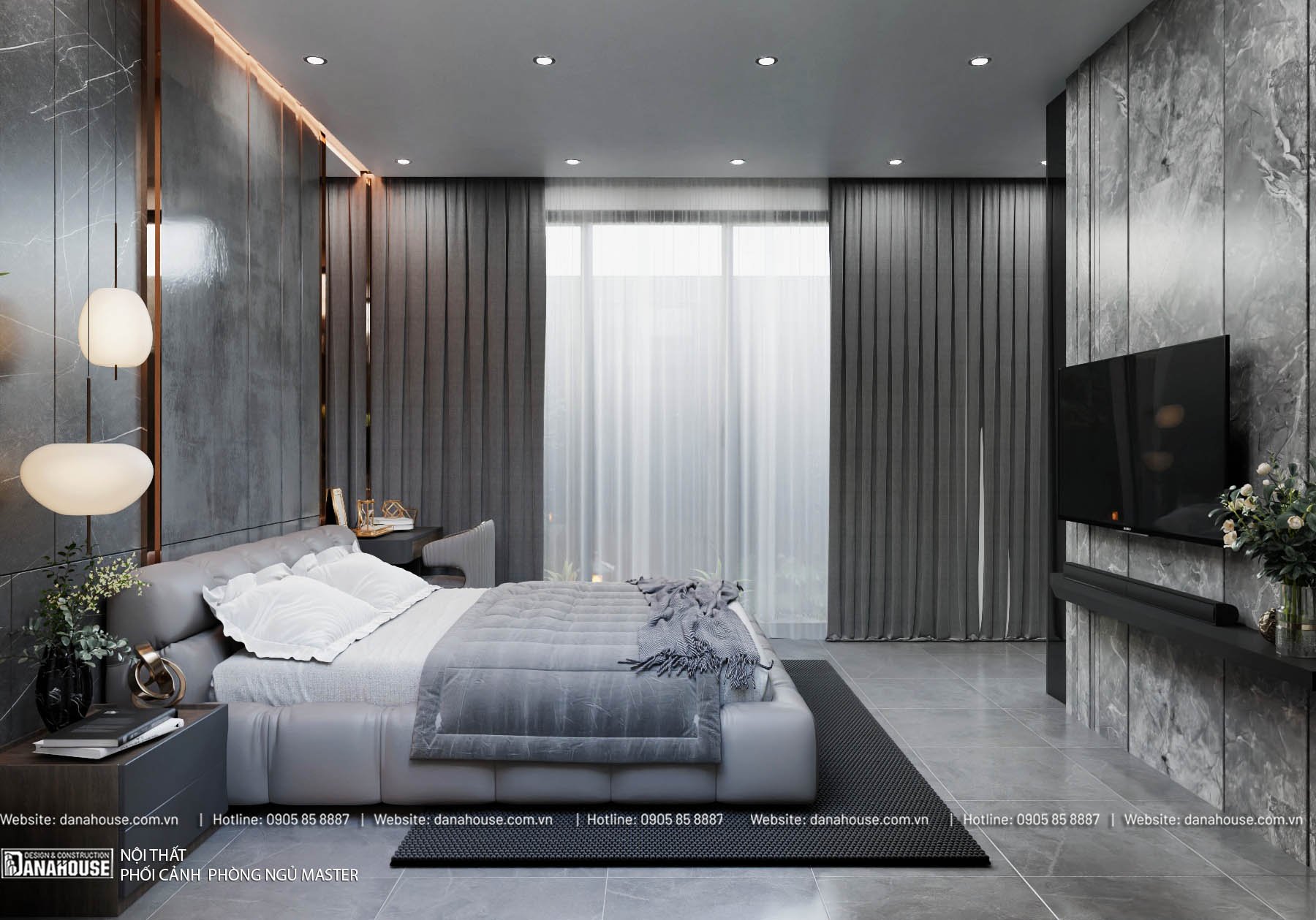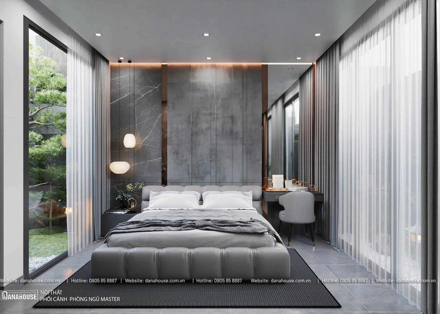 - Ánh sáng: Đèn ngủ hai bên giường, đèn trần mềm mại, cửa sổ lớn với rèm cản sáng.