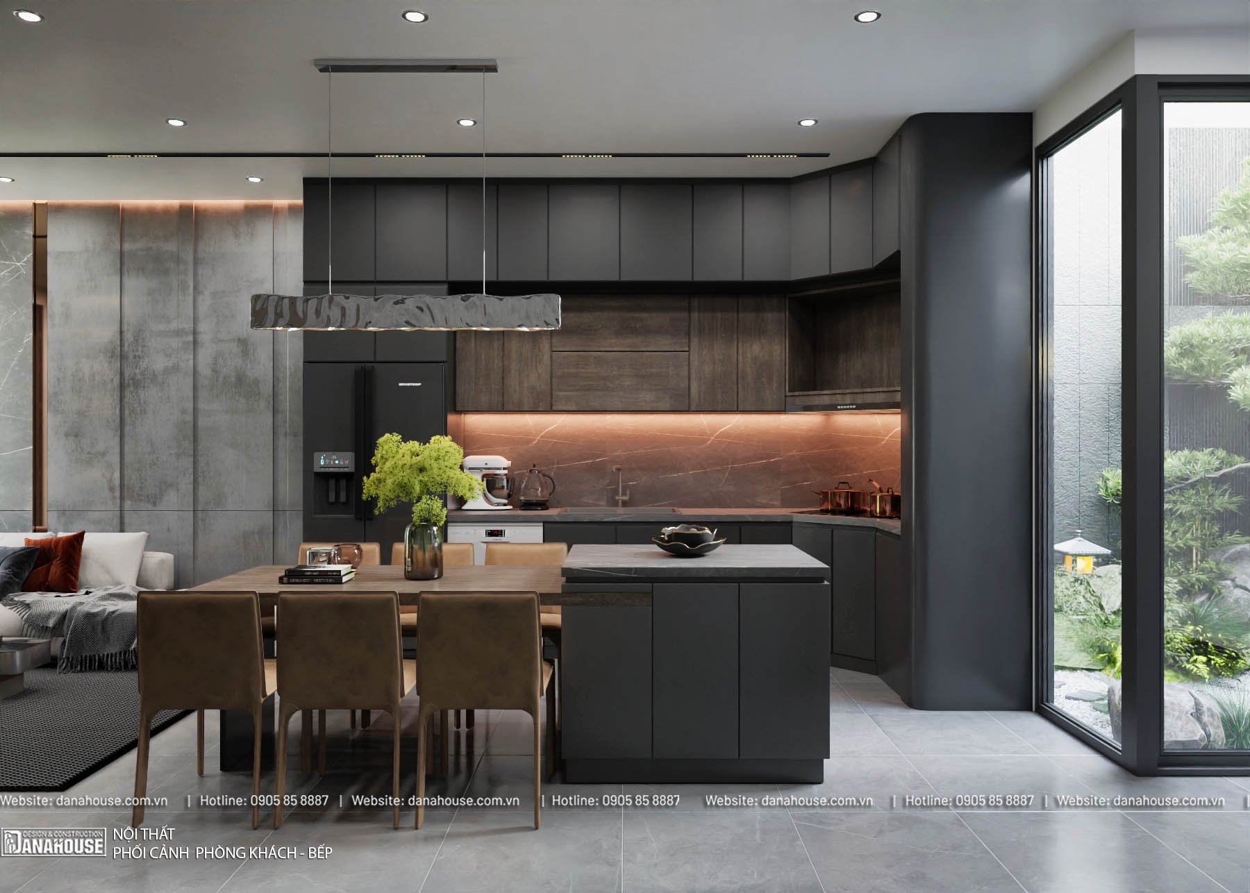 - Nội thất chính: Tủ bếp chữ L hoặc chữ U, bàn ăn gỗ hoặc kính, ghế ăn hiện đại.