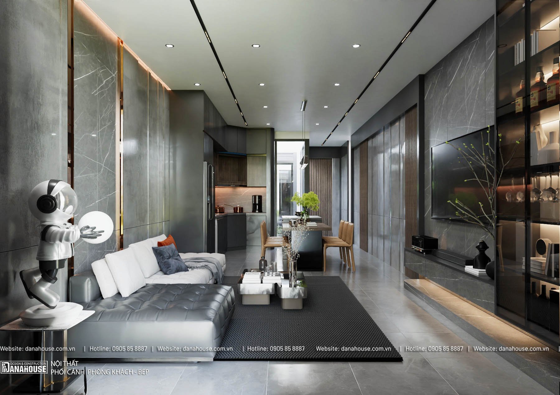 - Nội thất chính: Sofa lớn màu trung tính, bàn trà kính hoặc gỗ, kệ TV gắn tường hiện đại.