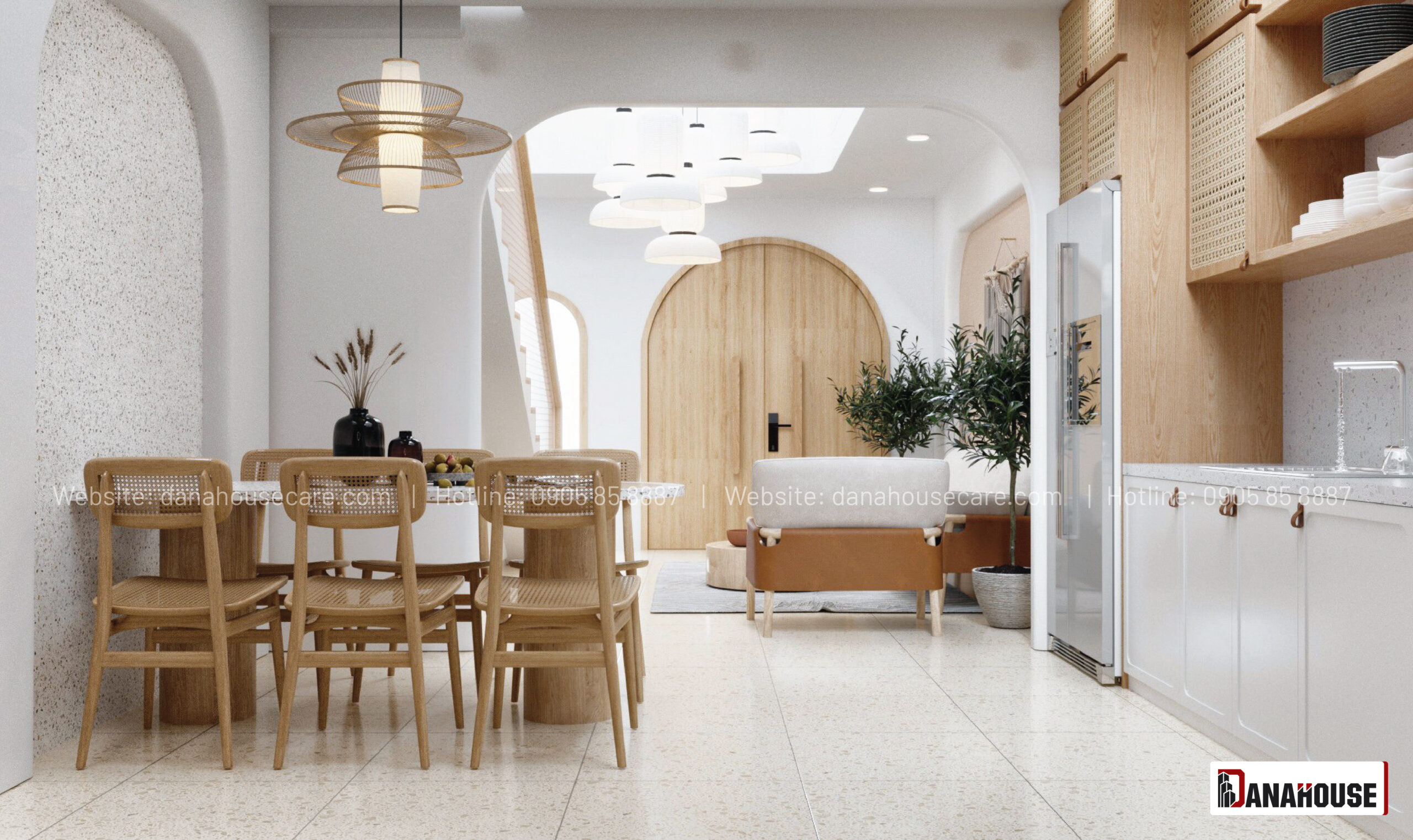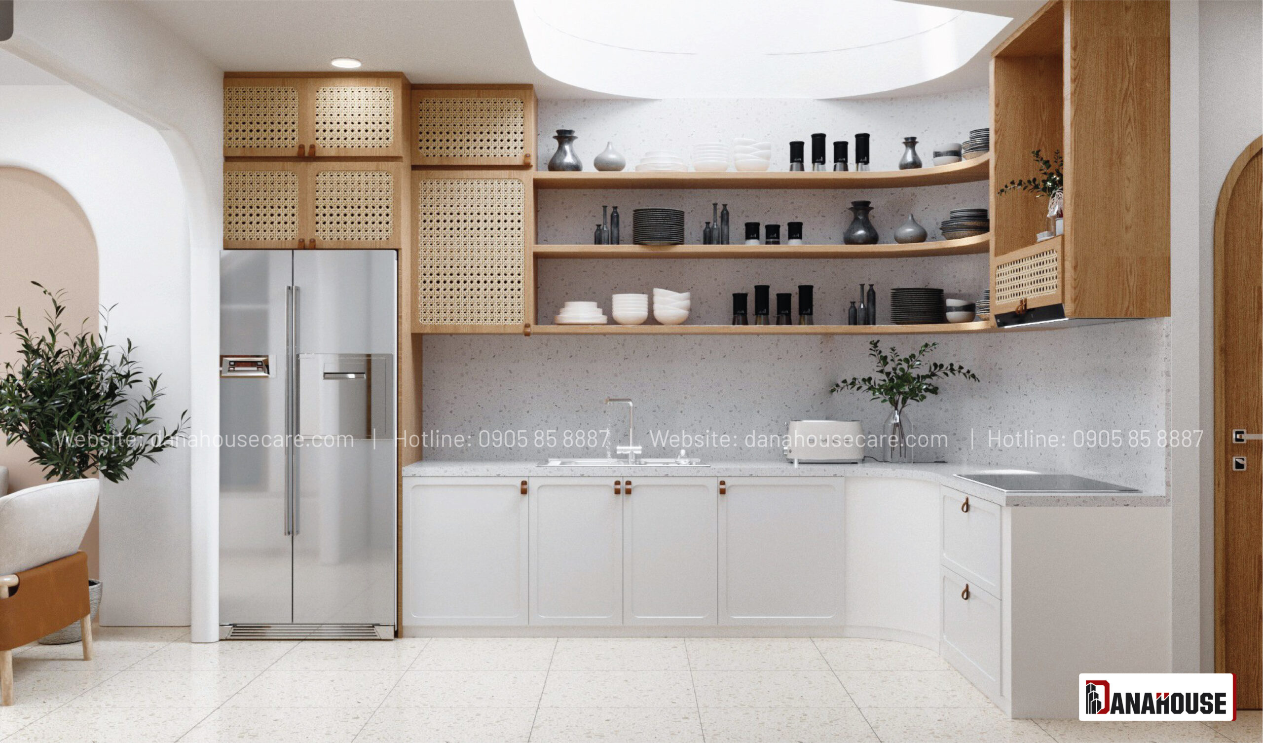 Phòng bếp là không gian nấu ăn và ăn uống của gia đình, được bố trí ở phía sau của tầng trệt, liền kề với phòng khách. Phòng bếp có diện tích vừa phải, sàn lát gạch men sáng màu, tường sơn màu xanh lá cây tươi mát. Phòng bếp được trang bị bộ tủ bếp gỗ cao cấp, bếp từ, máy hút mùi, chậu rửa bát inox và tủ lạnh. Phòng bếp còn có bàn ăn gỗ và ghế ăn cho 4 người. Phòng bếp có cửa ra vào phía sau nhà, thuận tiện cho việc vận chuyển thực phẩm và rác.