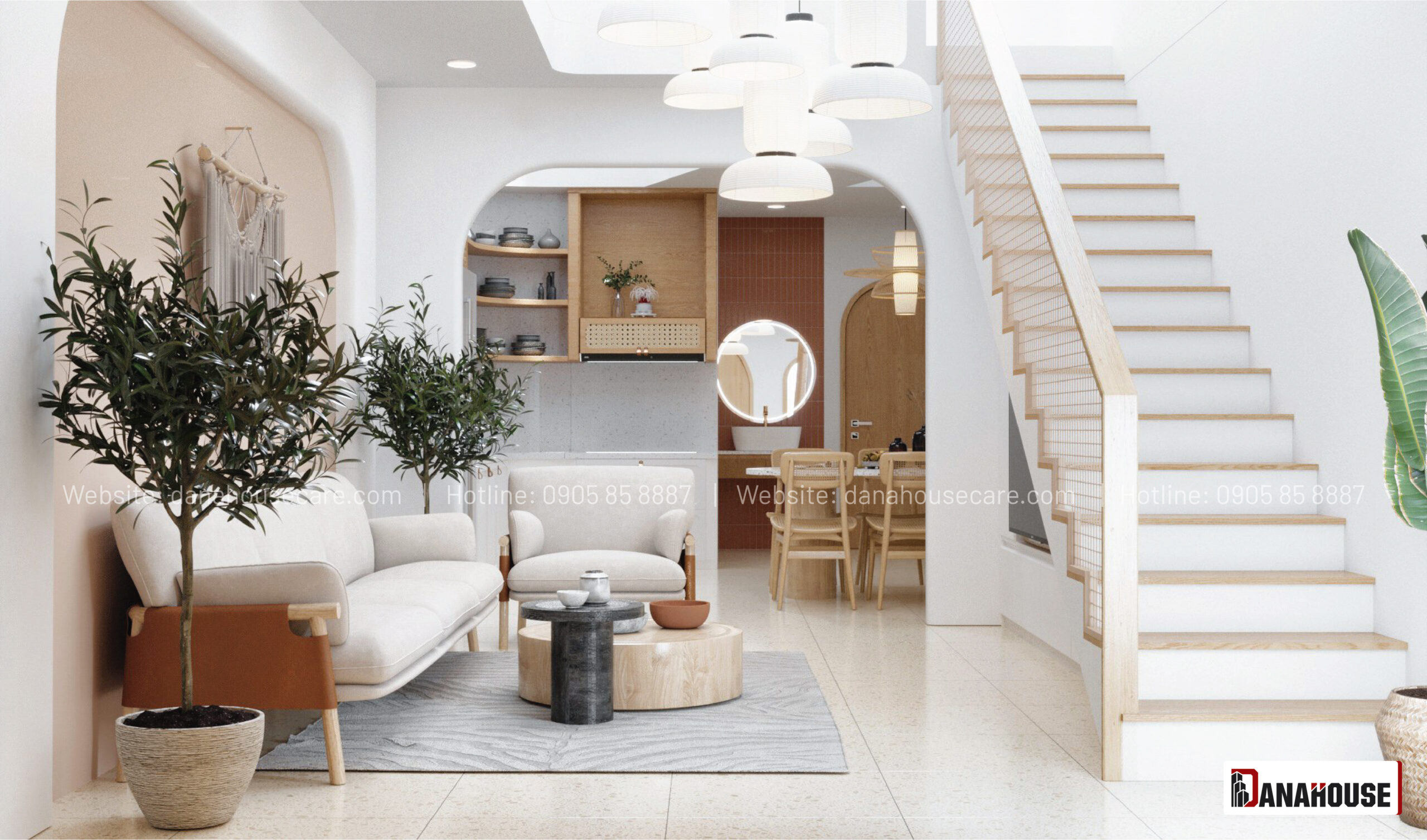 Phòng khách là không gian đón tiếp khách và sinh hoạt chung của gia đình, được bố trí ở tầng trệt, gần cửa ra vào. Phòng khách có diện tích rộng rãi, sàn lát gạch men sáng màu, tường sơn màu kem nhẹ nhàng. Phòng khách được trang bị bộ sofa da màu nâu sang trọng, bàn trà gỗ tự nhiên, tivi LCD treo tường và kệ tivi gỗ. Phòng khách còn có cửa sổ lớn nhìn ra sân trước, mang ánh sáng và gió vào phòng.