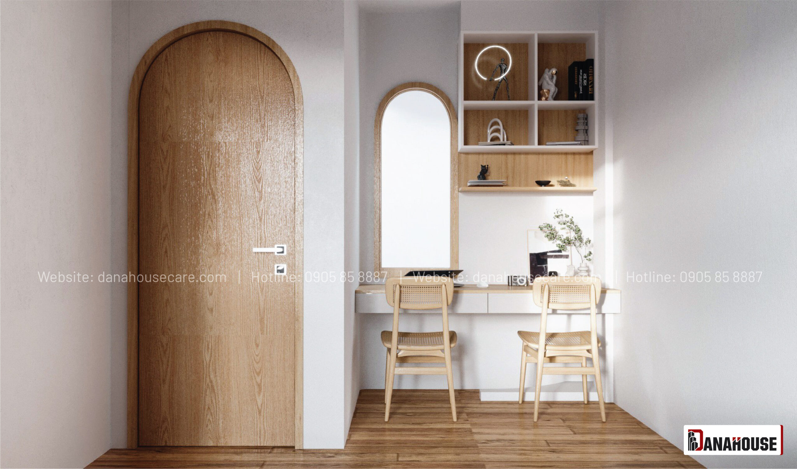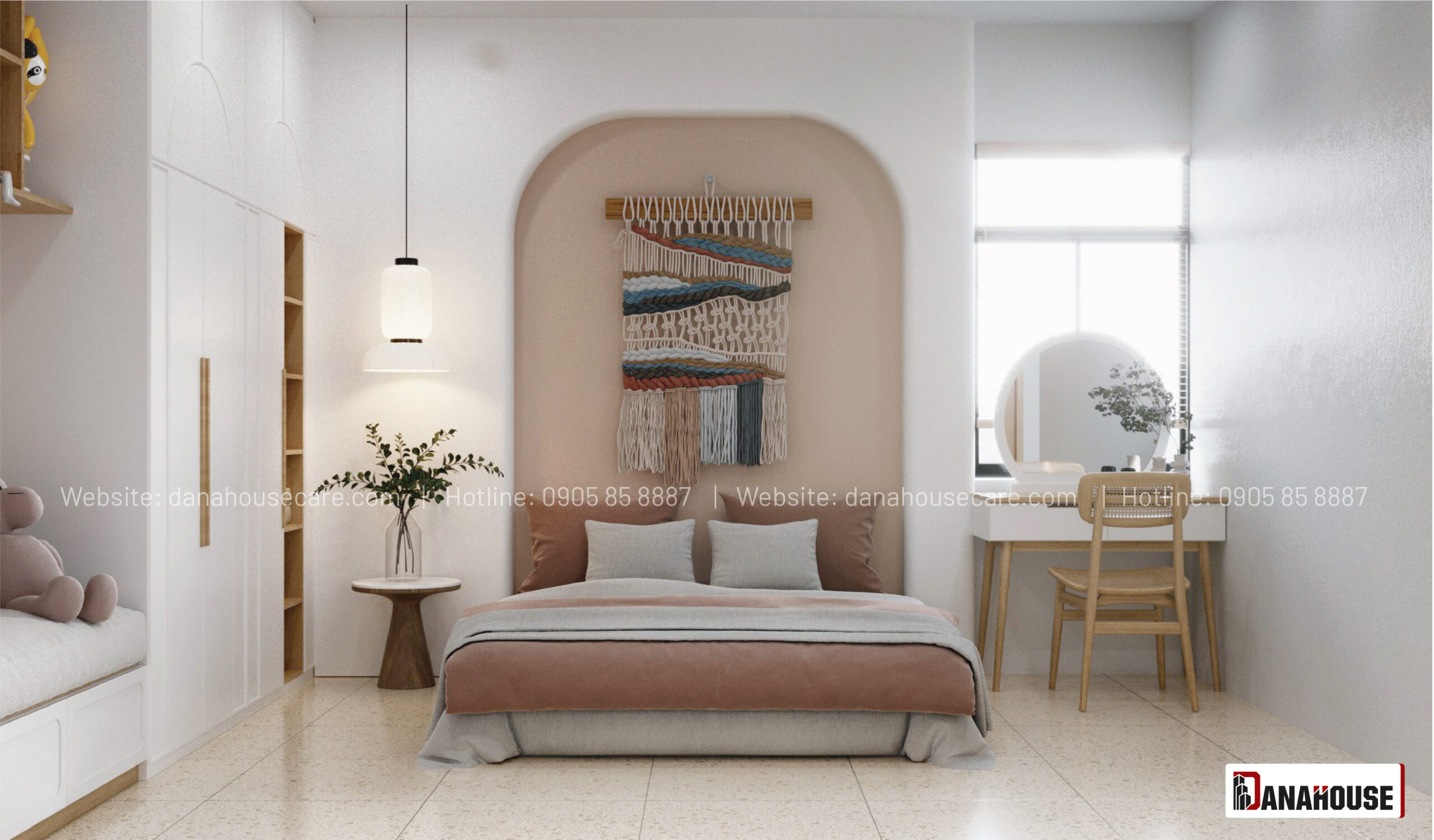 Phòng ngủ là không gian nghỉ ngơi và riêng tư của gia đình, được bố trí ở tầng hai. Mỗi phòng ngủ có diện tích khoảng 15m², sàn lát gỗ tự nhiên, tường sơn màu hồng nhạt. Mỗi phòng ngủ được trang bị giường ngủ gỗ lớn, nệm êm ái, chăn ga gối đệm màu trắng. Mỗi phòng ngủ còn có tủ quần áo gỗ rộng rãi, kệ sách gỗ nhỏ xinh và bàn làm việc gỗ. Mỗi phòng ngủ có cửa sổ nhìn ra ngoài, mang ánh sáng và gió vào phòng.