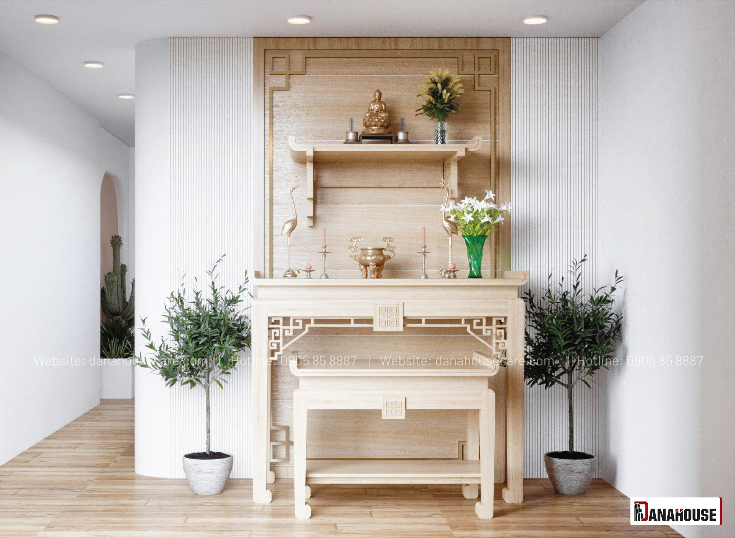 Phòng thờ là không gian tôn giáo và tâm linh của gia đình, được bố trí ở phía trước của tầng hai, gần cầu thang. Phòng thờ có diện tích nhỏ, sàn lát gạch men sáng màu, tường sơn màu vàng ấm áp. Phòng thờ được trang bị bàn thờ gỗ đẹp, tượng Phật và các vật phẩm thờ cúng. Phòng thờ có cửa sổ nhỏ nhìn ra sân trước, mang ánh sáng và gió vào phòng.