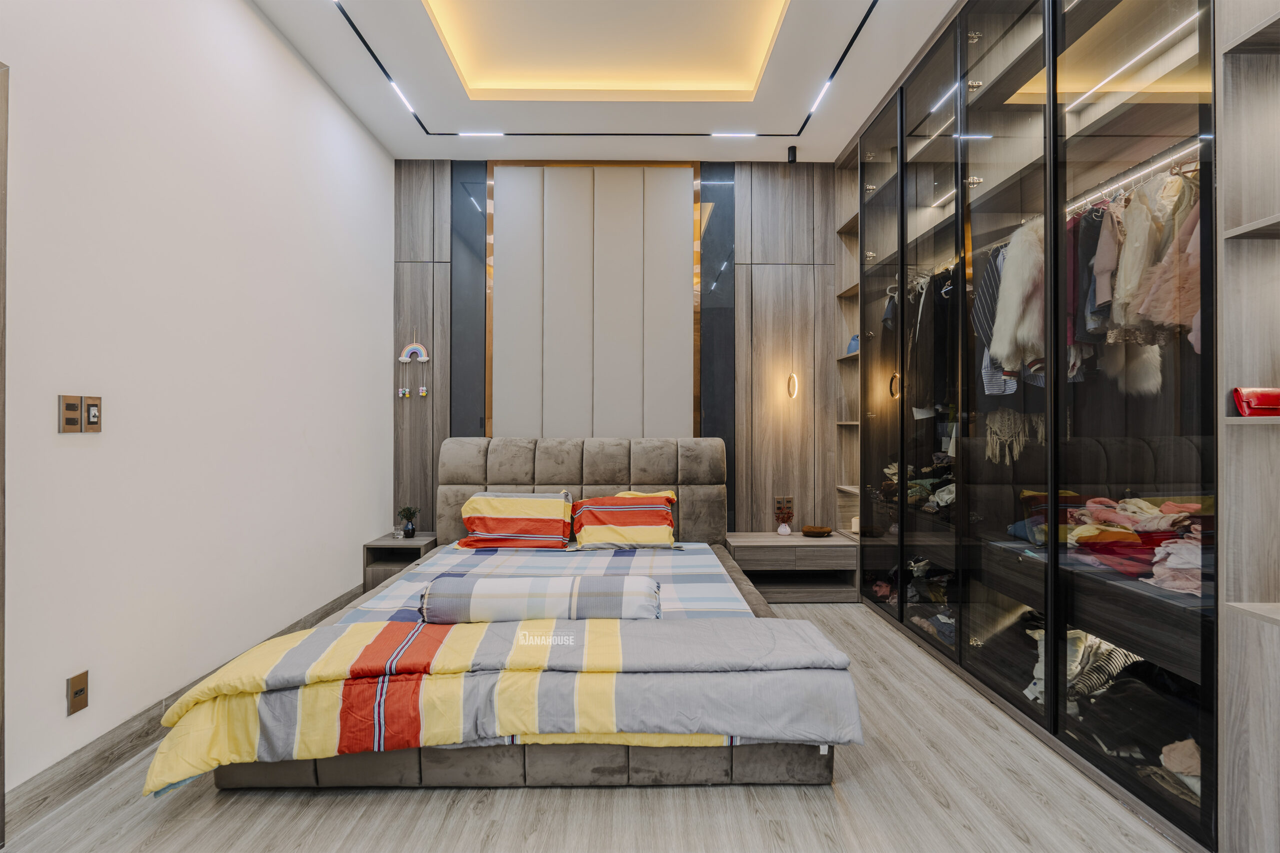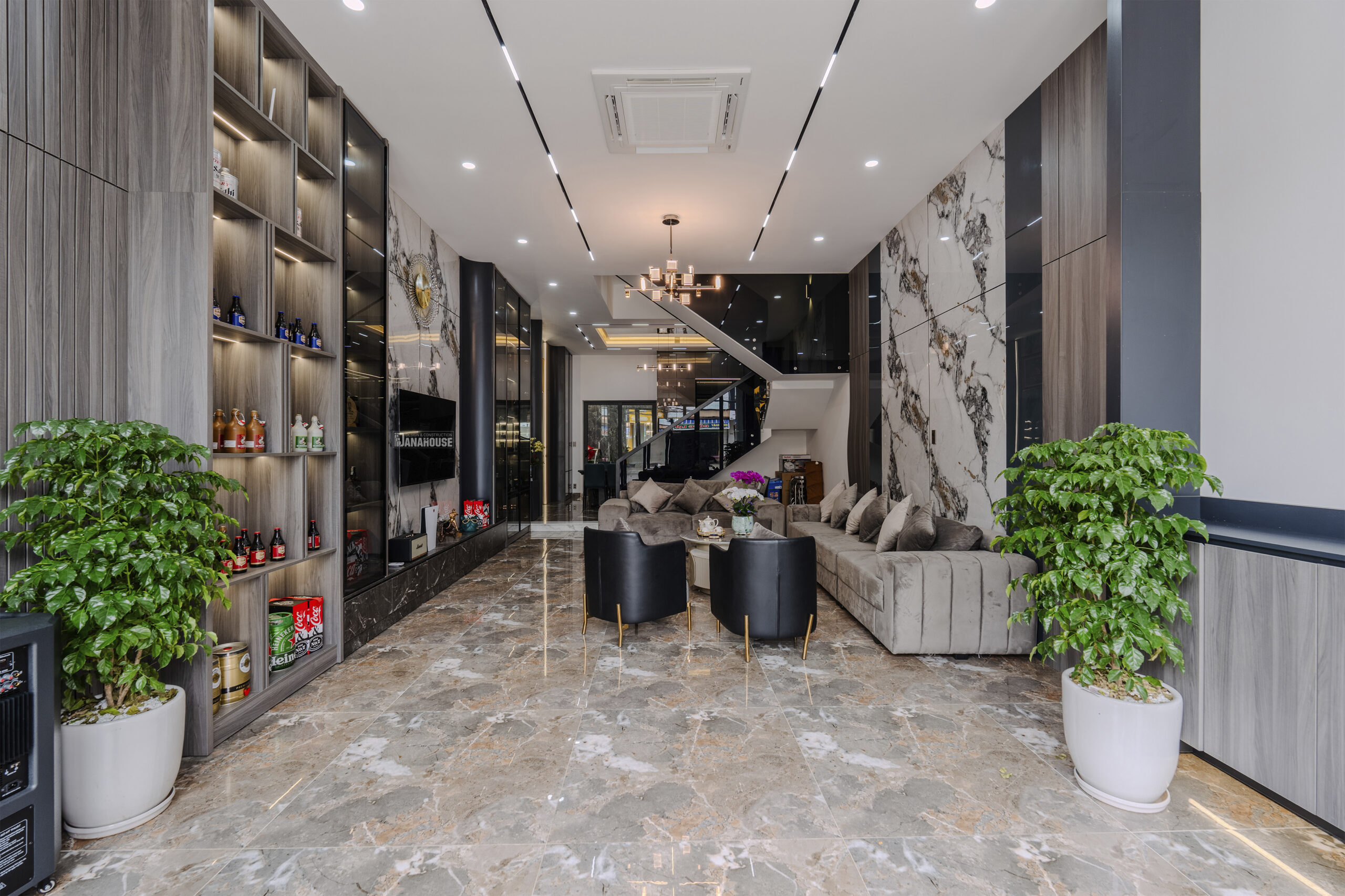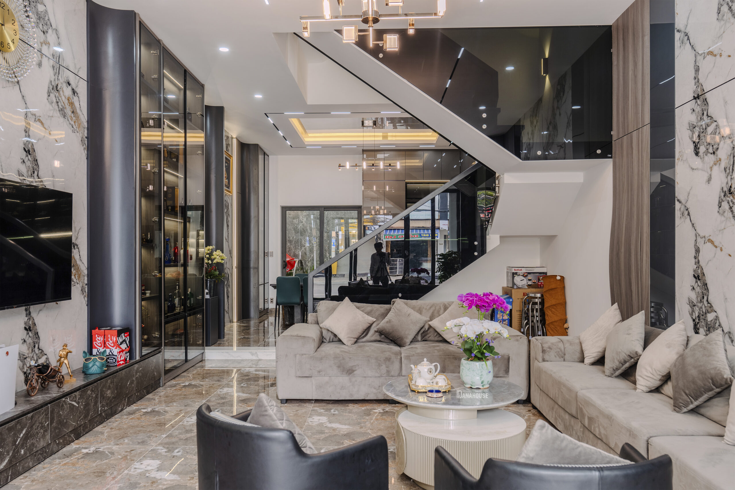 Mỗi không gian trong căn nhà được thiết kế và bố trí một cách hài hòa, tạo điểm nhấn cho từng chi tiết nội thất. Sự kết hợp tinh tế giữa gỗ tự nhiên và các vật liệu hiện đại như kính, kim loại, tạo nên một không gian ấm áp và sang trọng.