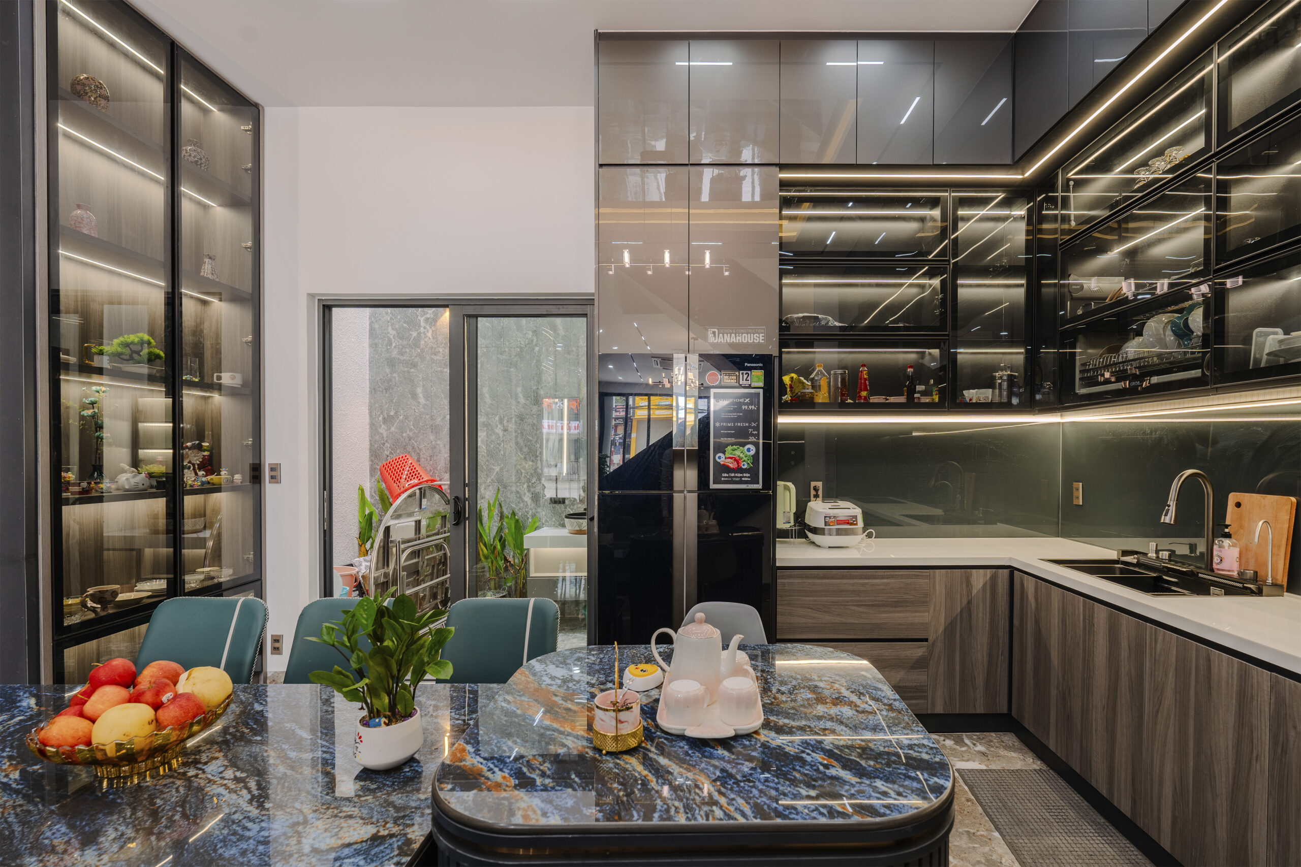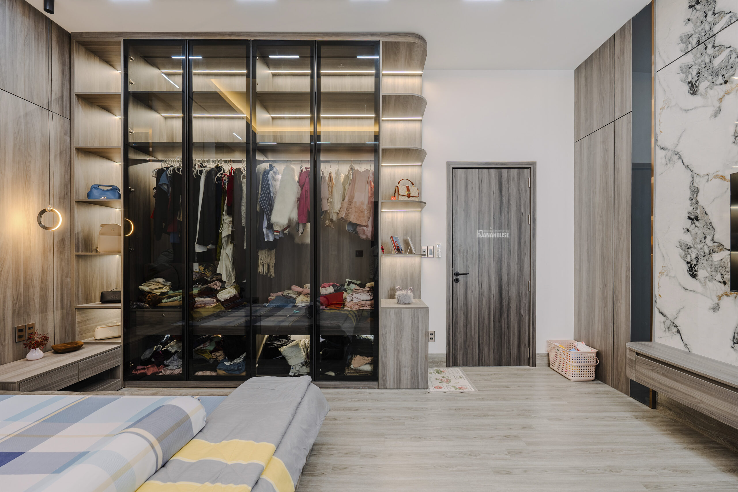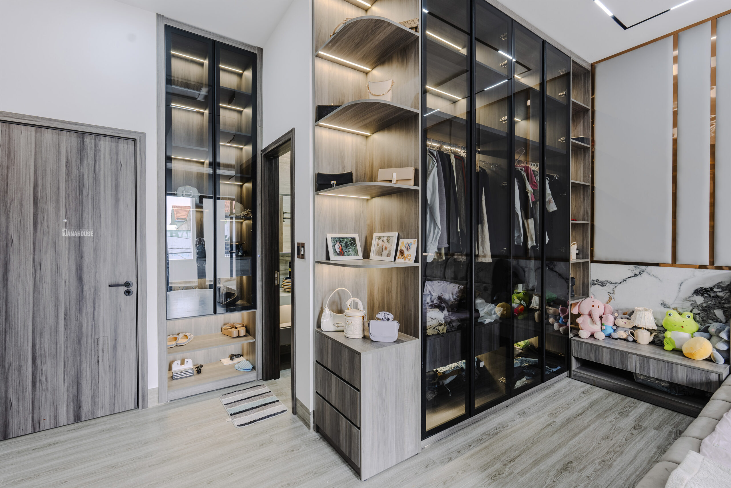 Mỗi không gian trong căn nhà được thiết kế và bố trí một cách hài hòa, tạo điểm nhấn cho từng chi tiết nội thất. Sự kết hợp tinh tế giữa gỗ tự nhiên và các vật liệu hiện đại như kính, kim loại, tạo nên một không gian ấm áp và sang trọng.
