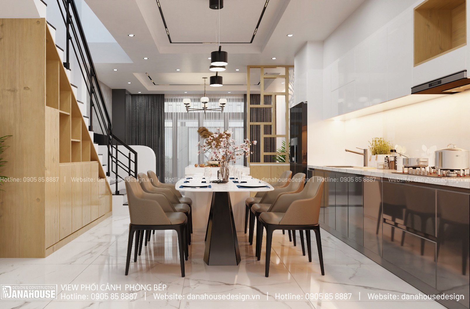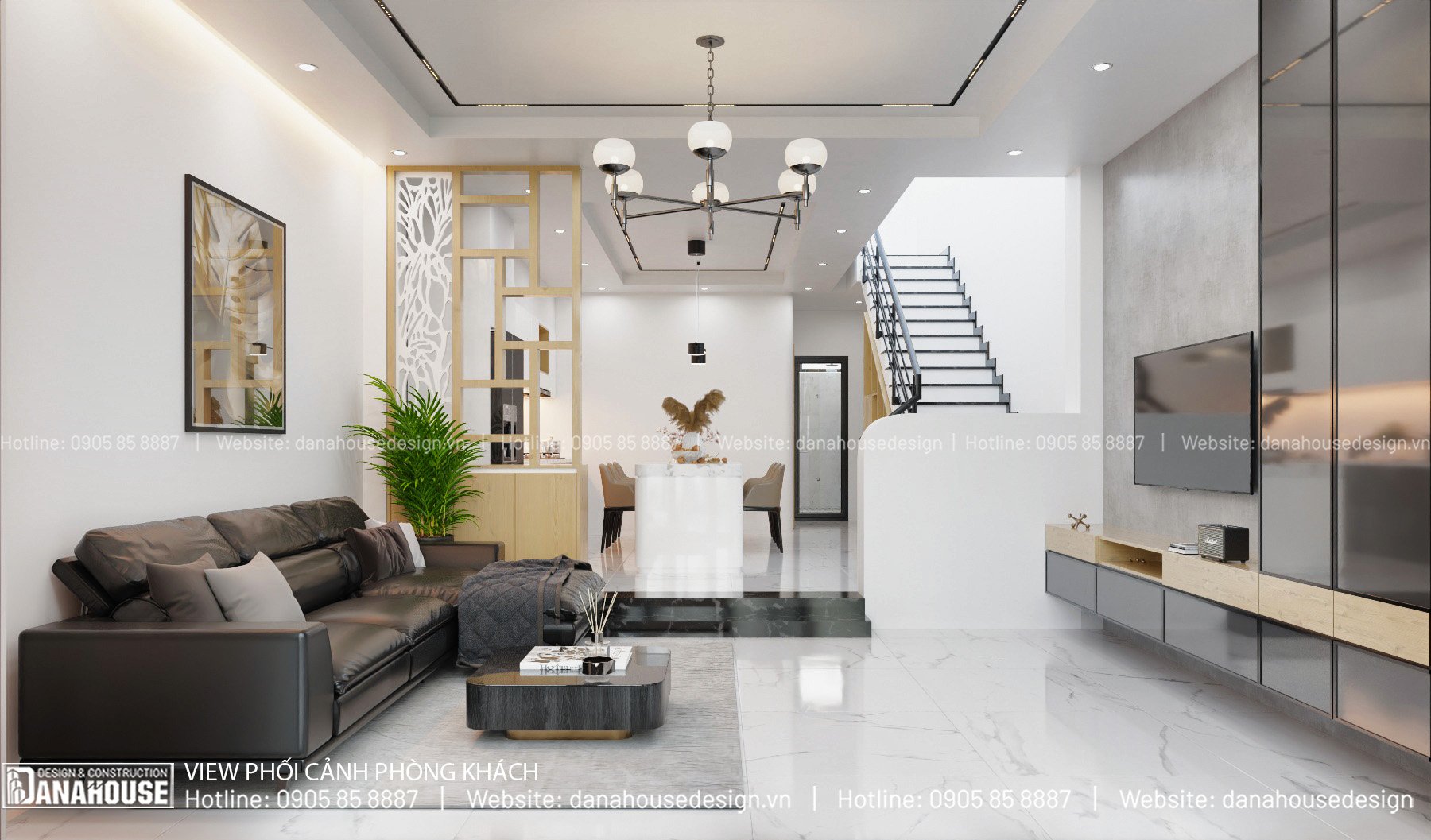 Đặc điểm nổi bật của dự án này là sự kết hợp hài hòa giữa màu sắc đơn giản, tinh tế cùng với những tiện nghi hiện đại mà Danahouse đã tạo ra một không gian ấm áp và gần gũi. Mỗi phòng trong căn nhà đều được thiết kế một cách thông minh và linh hoạt, tối ưu hóa không gian và ánh sáng tự nhiên. Phòng khách rộng rãi thông với khu vực bếp tạo nên một không gian thoải mái và tiện lợi.